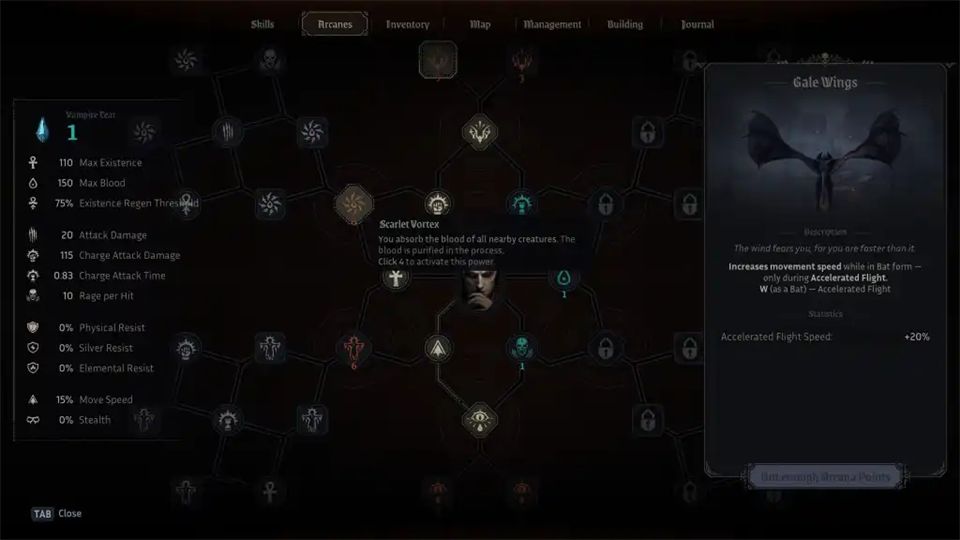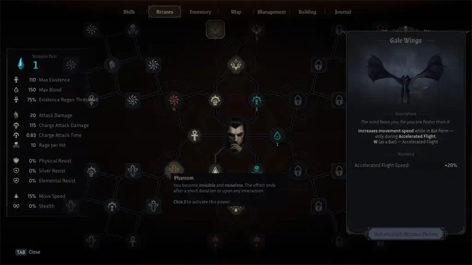 解锁疾风之翼和静音之翼不仅能提升速度,还能降低血液消耗速度。后者还会降低蝙蝠形态下被敌人发现的概率。