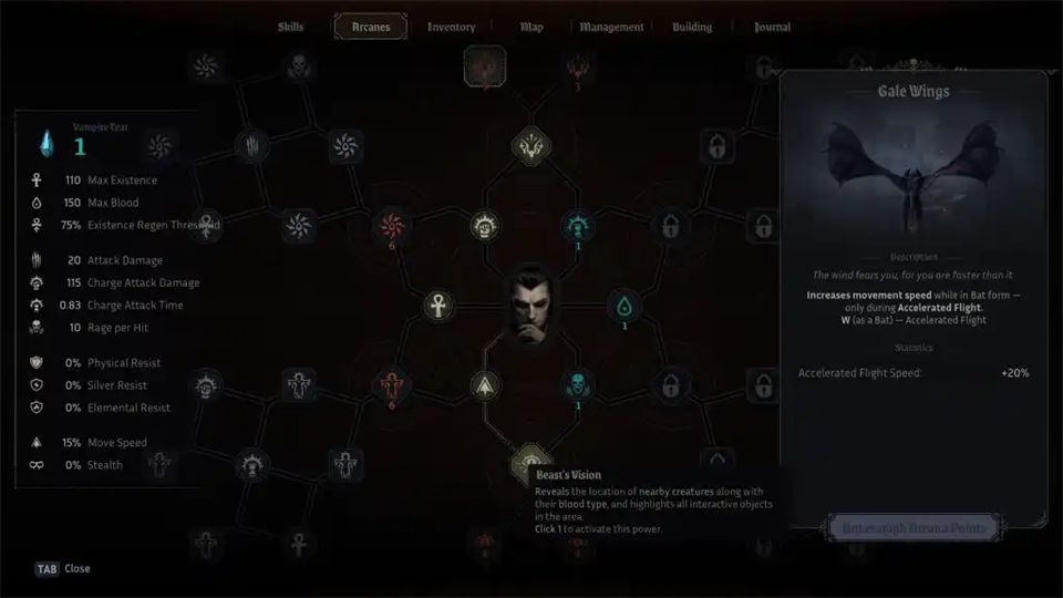 不过你无法立即解锁它,因为它需要九枚吸血鬼之泪,说实话,这花费不少。不过,吸血鬼之泪并不难找,所以我建议先收集并解锁这个能力。夜翼虽然消耗更多血,但非常有用。