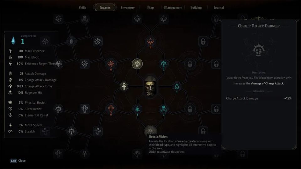 技能树右侧的能力需要更多吸血鬼之泪才能解锁。这是因为一个能力与另一个需要先解锁几个能力的能力相连。