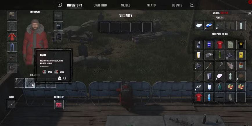 在地面上装备简易背包和你能找到的最好的斧头。如果你找到近战武器,也装备它。最后,装备简易锤子。