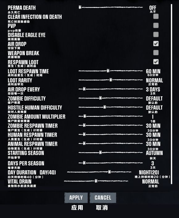大多数选项都是不言自明的。如果这是你第一次玩生存类游戏,减少丧尸和A.I.的难度可能是一个好主意——它们可能非常无情!