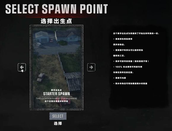 我建议你第一次尝试玩这个游戏时选择第一个选项Starter Spawn(新手出生点)。