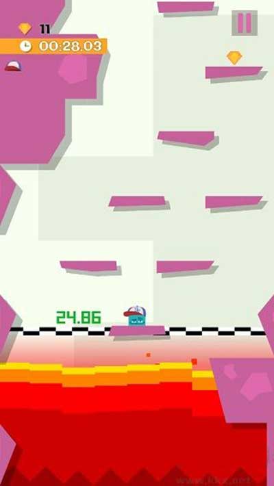 2、挑战开始后岩浆会自下而上迅速蔓延,迫使玩家不断向上逃离,类似设定在同类游戏中独具特色。由于每次跳跃都需要玩家主动操作,角色移动轨迹稳定可控,与《涂鸦跳跃》的自动跳跃机制形成鲜明对比。