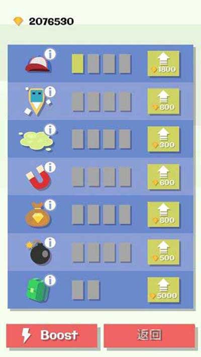 3、辅助道具系统丰富实用,火箭推进器提供短时垂直冲刺,磁铁装置自动吸附周边金币,防撞头盔抵御一次失误伤害。