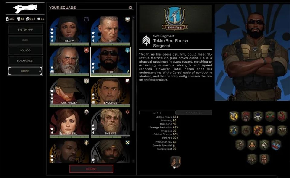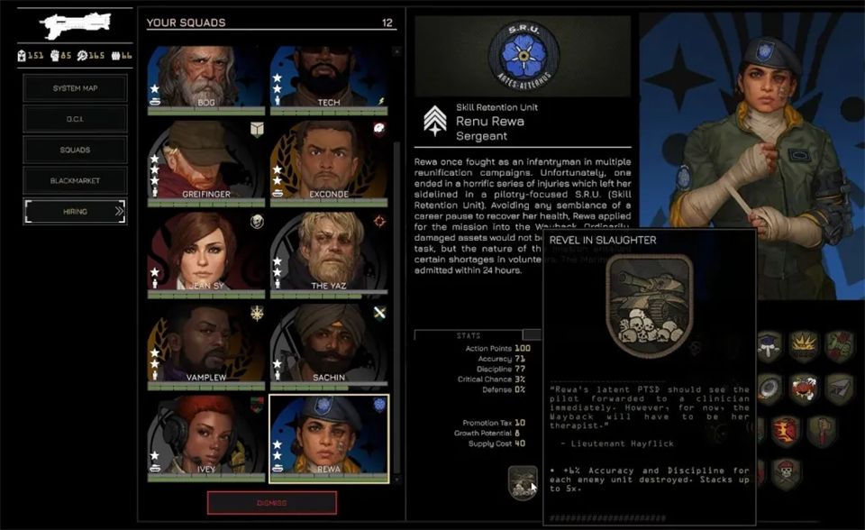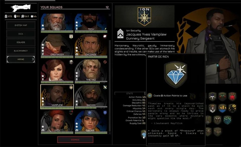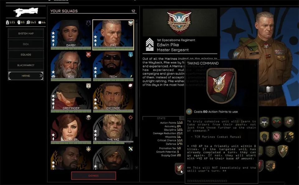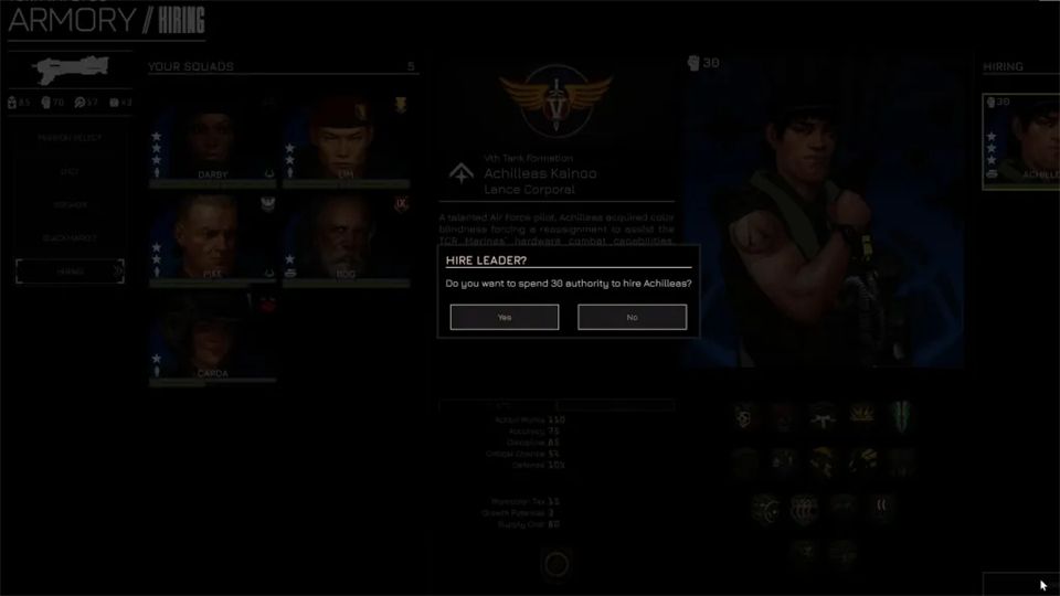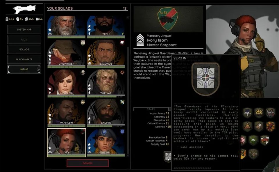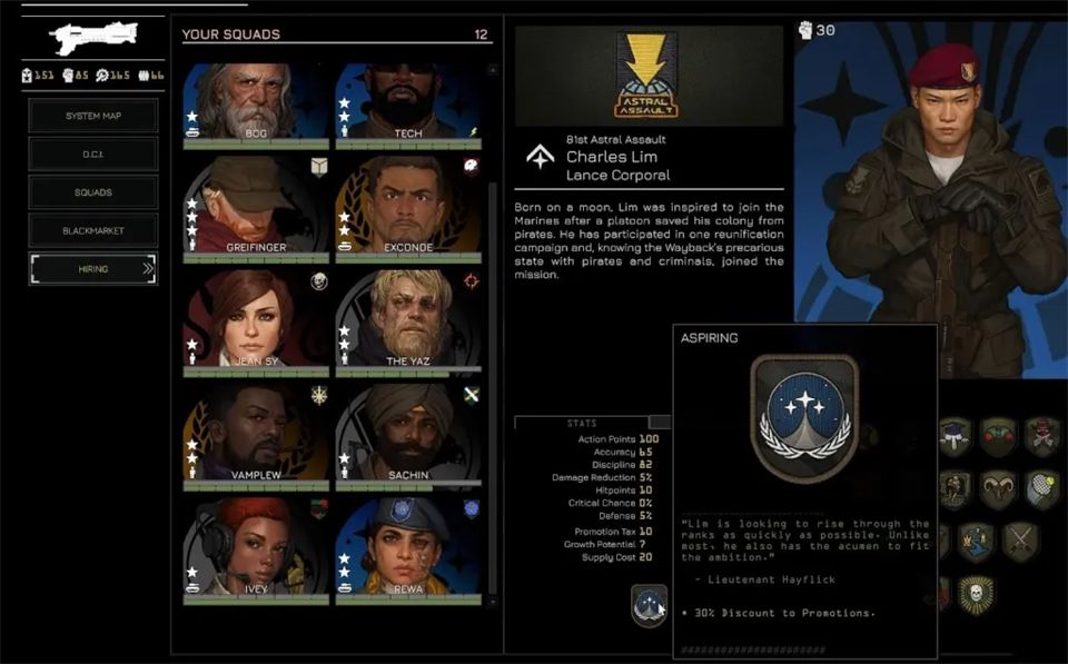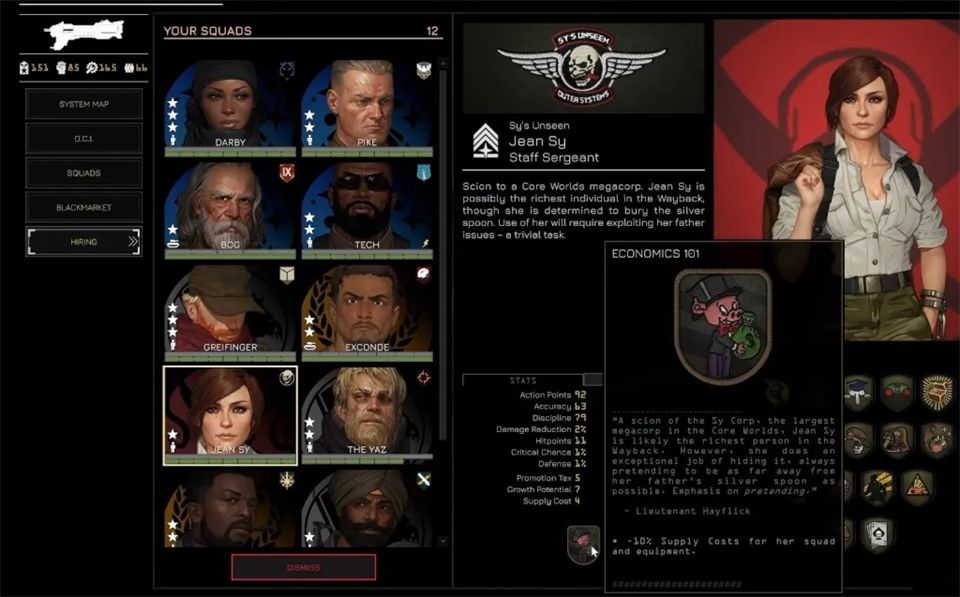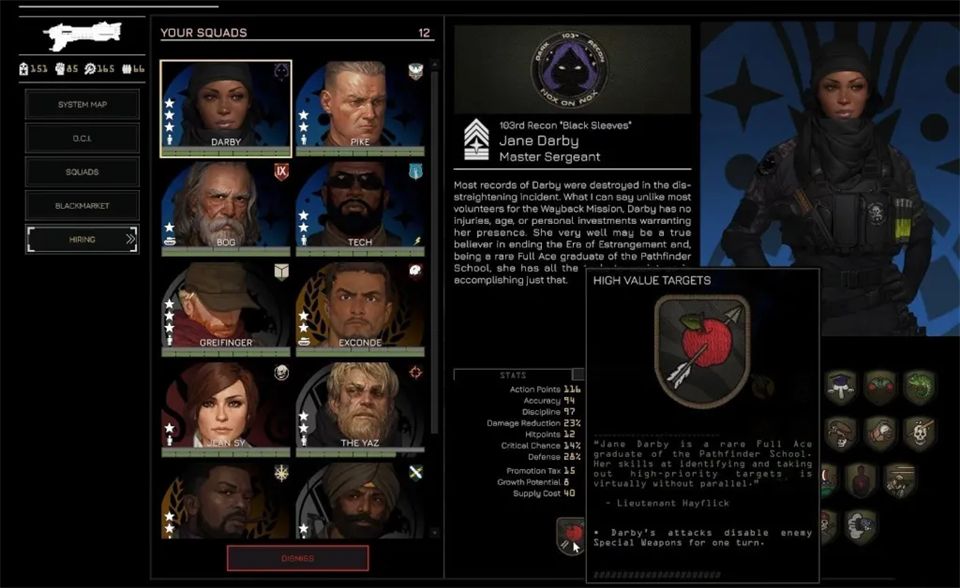 招募通过黑市在任务间进行,你可以从左侧菜单进入黑市。这里列出了所有贸易商品,包括可招募飞行员和小队长的情报档案。购买档案会随机增加一名飞行员或小队长,但这并不意味着他们能立即使用。要真正激活一个新角色并让他们可以部署,你需要花费权威值。