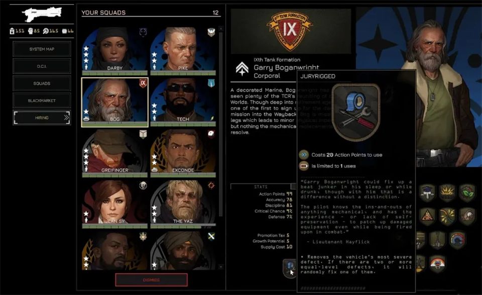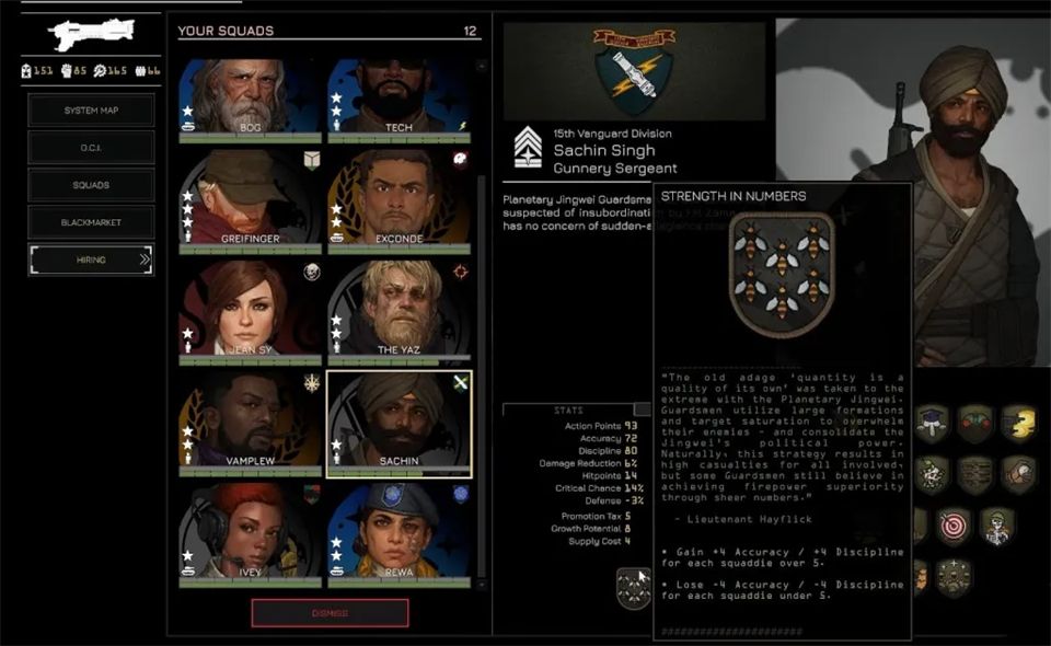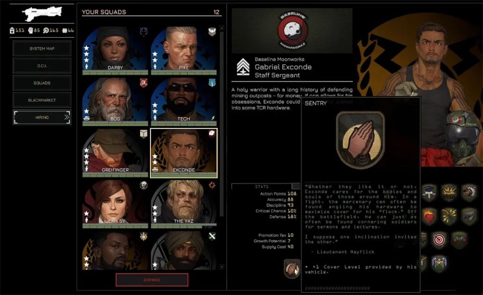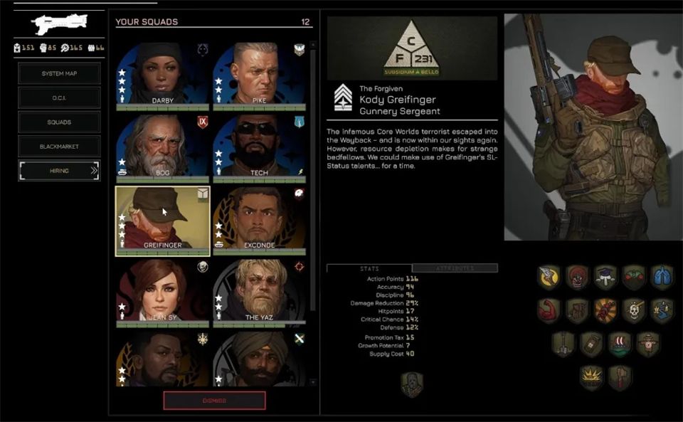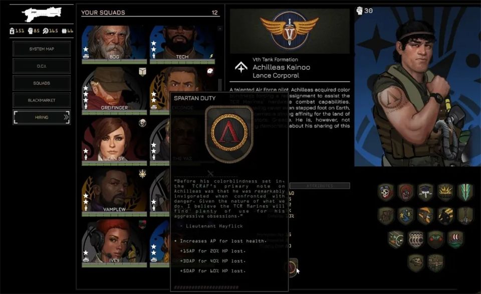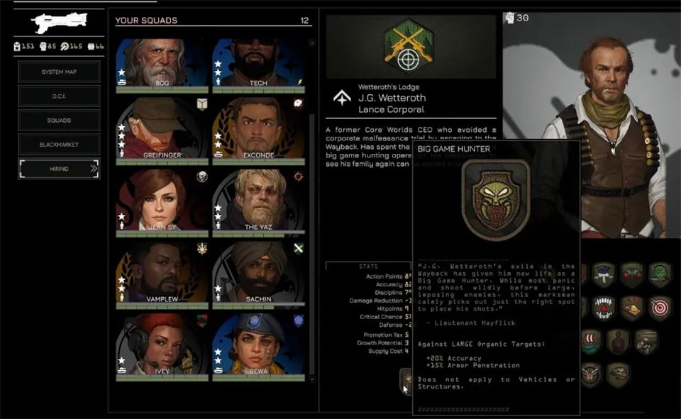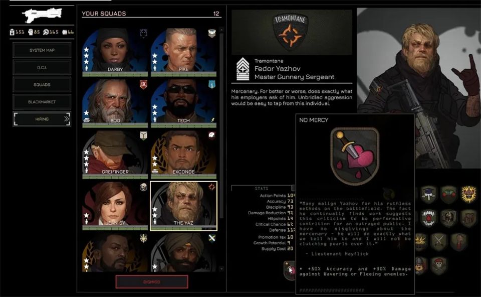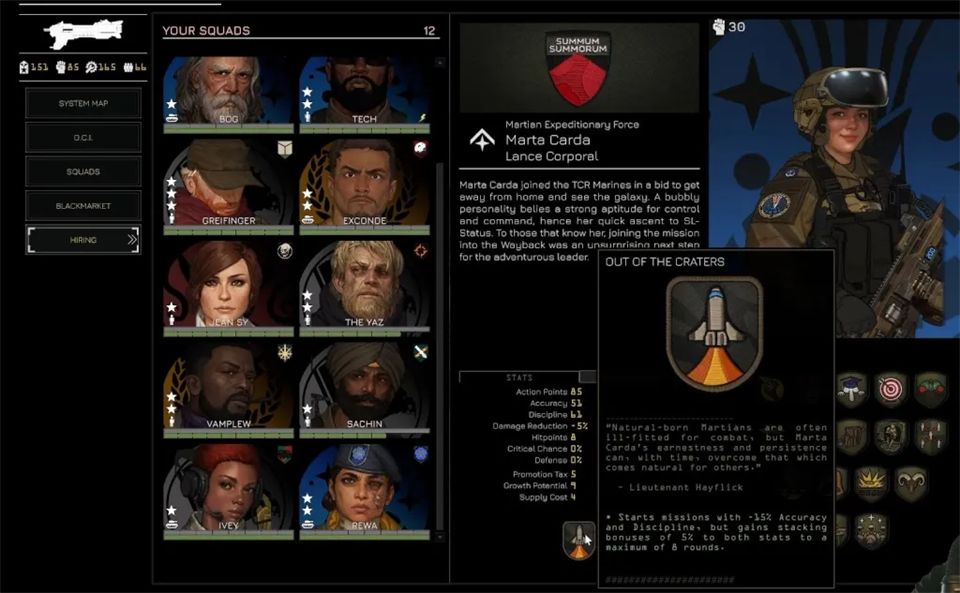 招募通过黑市在任务间进行,你可以从左侧菜单进入黑市。这里列出了所有贸易商品,包括可招募飞行员和小队长的情报档案。购买档案会随机增加一名飞行员或小队长,但这并不意味着他们能立即使用。要真正激活一个新角色并让他们可以部署,你需要花费权威值。