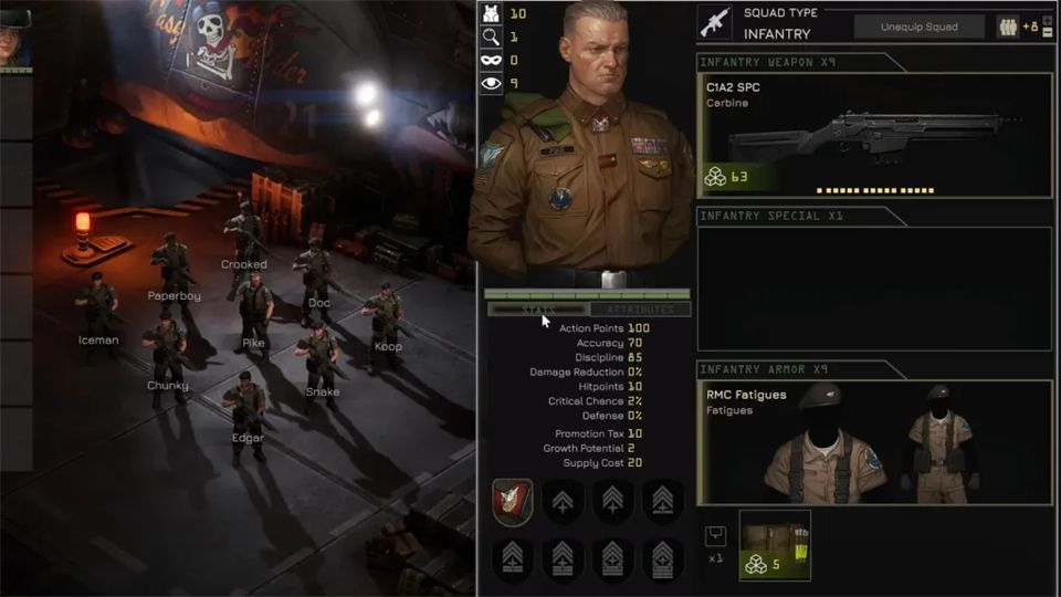 为了干净、无压力的开始,建议带3名步兵SL和1名飞行员。提前抓两个飞行员通常不划算,因为你暂时也没有第二辆载具。等到真正需要飞行员时,招募另一个飞行员要容易得多。