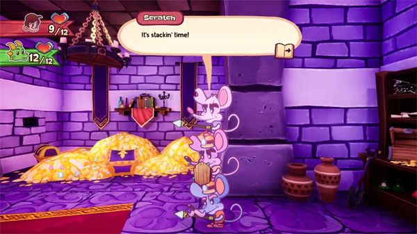 里面会有几只老鼠偷黄金。对话结束后,你将不得不与他们展开战斗。它们会叠加,所以用你们两个角色一起攻击下层的那个。然后用火焰吐息解除护盾。