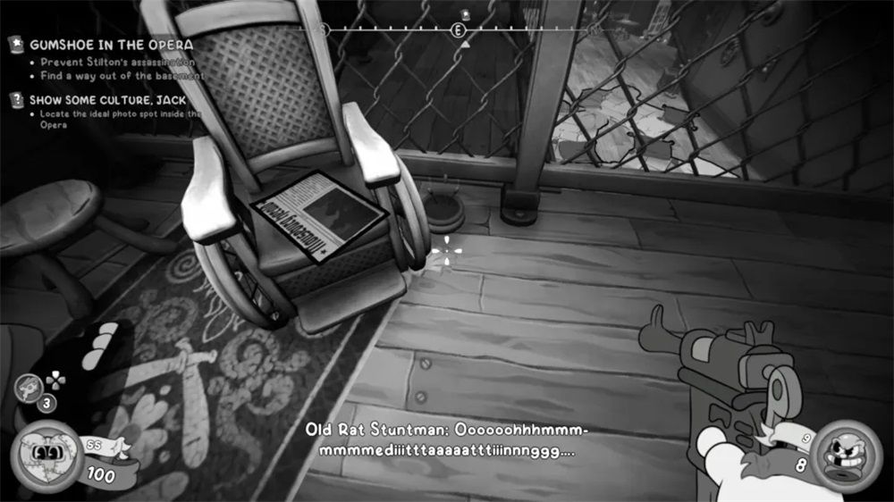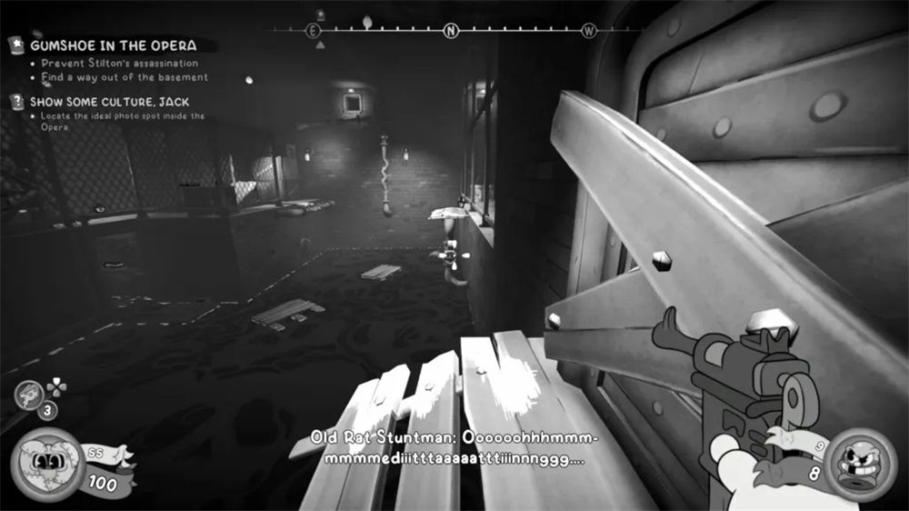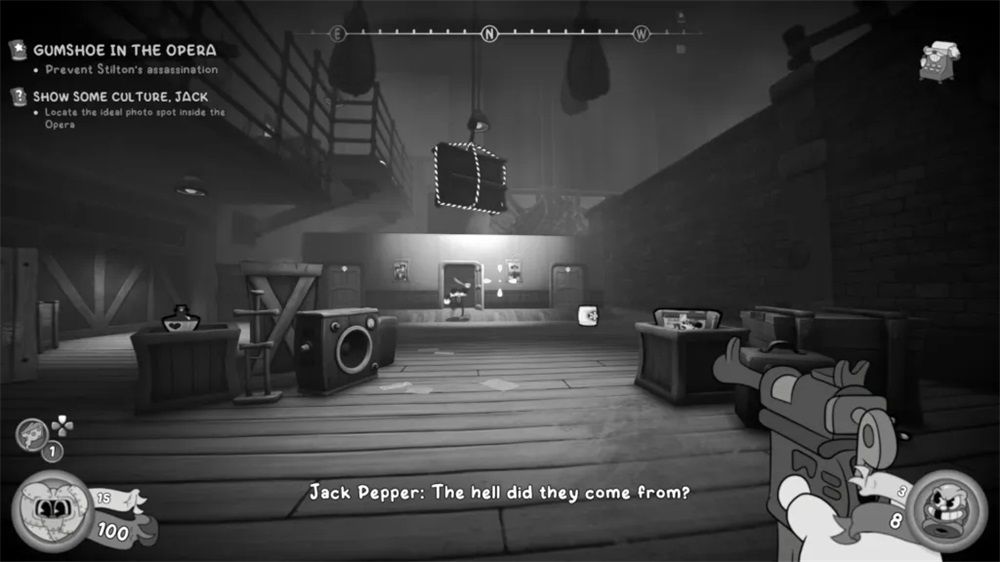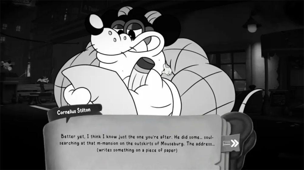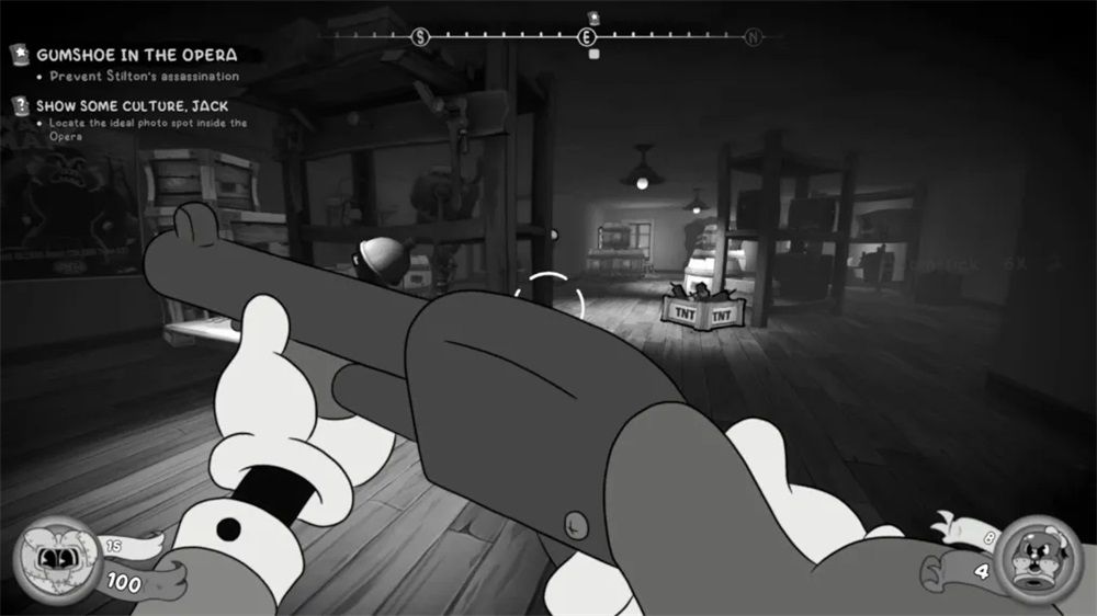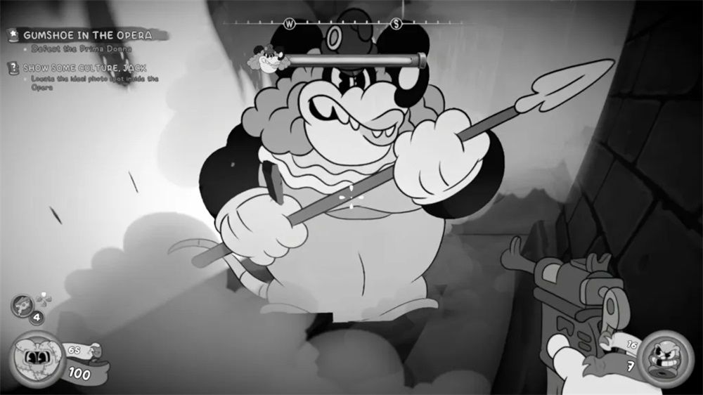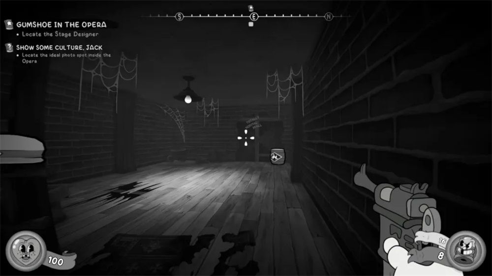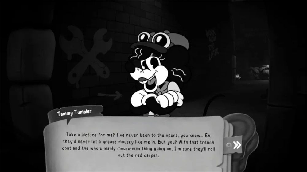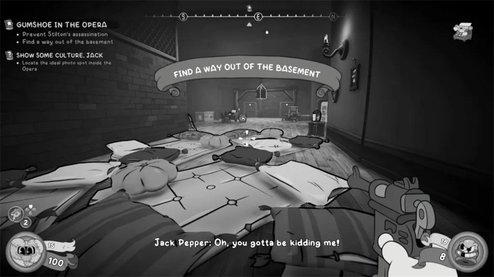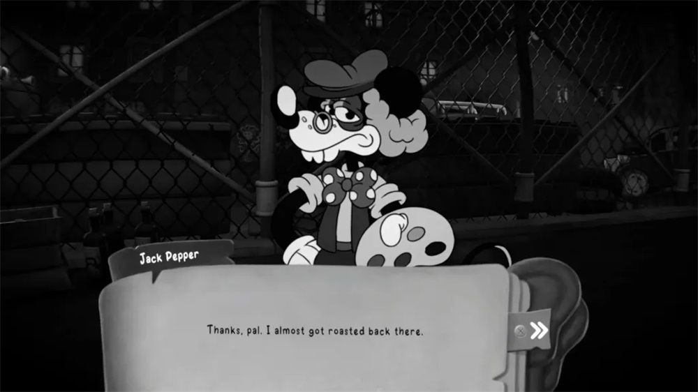 神探杰克鼠2026最新版(MOUSE:P.I.ForHire)是一款融合了橡皮管动画风格的第一人称射击游戏,玩家将与私家 侦探杰克·佩珀一起深入腐败的鼠城,揭开层层谜团、探寻真相。融合快节奏第一人称射击与侦探解谜特色,玩家既要在枪林弹雨中灵活移动、利用特色武器与强化道具横扫敌人,也要细心搜集线索、分析证据,在战斗与推理中找到真相。游戏设计了20余个黑色的电影风格关卡,场景涵盖阴暗街道、电影制片厂、歌剧院等,玩家在各场景中搜集到的线索会在线索墙上自动关联,形成完整的证据链,帮助玩家破解阴谋。游戏的战斗的过程也进行了卡通化表现,敌人被击中会夸张地扭曲、拉伸、弹跳,头部中枪会炸开一团墨水,身体中枪会出现卡通弹孔,不同武器具有不同死亡效果。