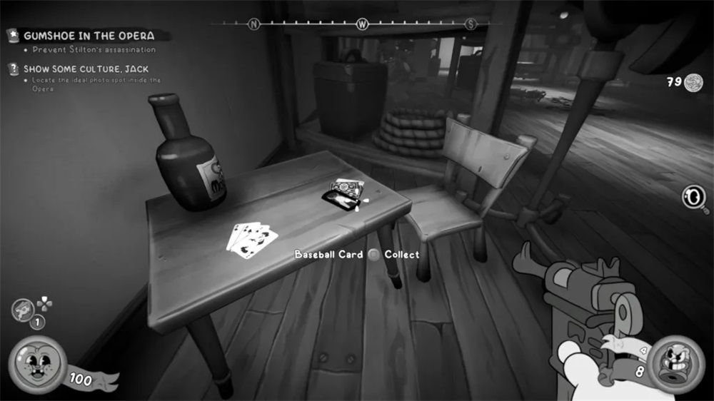 击败敌人后,继续前进,摧毁另一面墙以打开通路.右手桌子上有一张棒球卡。