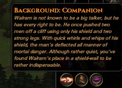游戏开始会默认给玩家3个佣兵,基础属性一般比较好,背景为攻防属性少量加成的COMPANION(创始人)