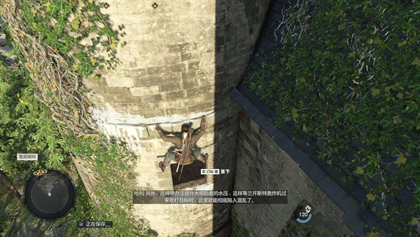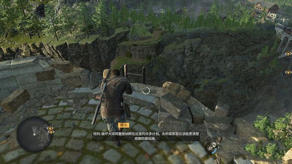 2、途中需要消灭敌人,清理障碍,当你经过悬挂着纳 粹旗帜的大房子后,右侧会现出一个滑索,利用它下降到地面,秘密任务便解锁了。