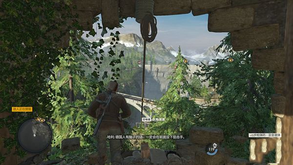 2、匿身草丛,寻觅有利视角,潜伏其中,逐个狙击内外敌人,诱使Coste现身。