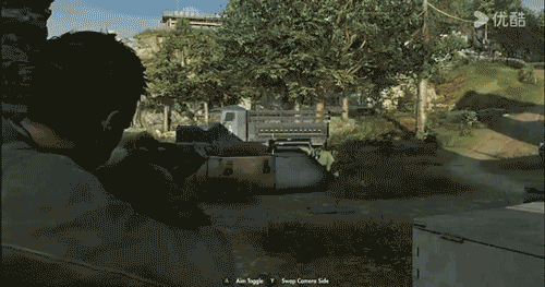 5、爬上北侧木平台获最佳视角,用狙击步枪瞄准油罐车发光红色部件,摧毁所有车辆。