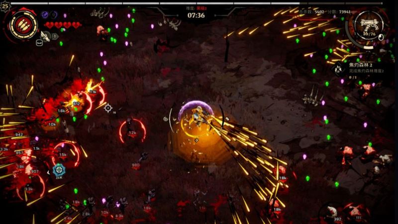 2、爆炸性的子弹地狱体验:游戏呈现残酷且华丽的视觉效果,玩家将在满屏的弹幕中穿梭,体验肾上腺素飙升的生存快感。