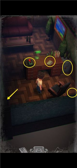 8、左边有一棵小疗伤药,上面的机关需要四角手轮,管理员日记里提示手轮在洗手间,办公室里的酒瓶不让人动(与密码有关)。地上坐的是个怪,这游戏里除了主角任何人形生物都是怪,所以不要在他旁边晃悠的时间太长,尽量最后拿箱子上的钥匙,拿了怪会站起来咬你,不要惊慌,拿完跑出去就可以。