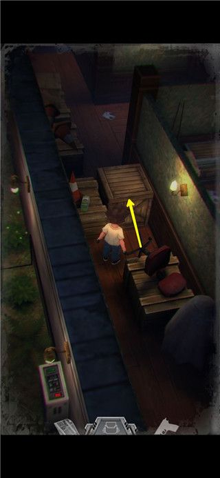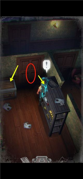 4、箱子是储物箱,可以存储物品(男主的背包容量有限,可以把暂时用不到的东西装进储物箱)。杂物间的门需要钥匙,用红圈标识。走到如图所示的位置,按照箭头的方向面向这个铁制置物架,松开,长按屏幕任意处就可以朝男主面向的方向推动物品,把架子推开后,从墙壁空缺处走进另一个房间。