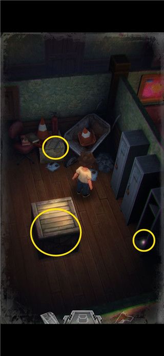5、地上的箱子向任意方向推动,拾取箱子下面的杂物间钥匙;柜子里拾取9mm弹夹;门口的纸箱上放着管理员日记二