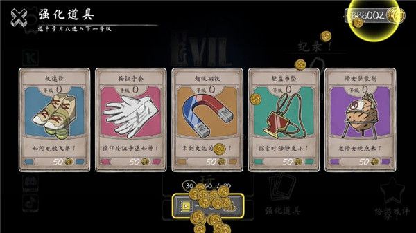 如果你觉得游戏难度太多,可以主界面的强化道具中购买道具,减缓游戏难度,这里提供的道具如闪电般飞奔速度的极速鞋,还有操作按钮手速入神的按钮手套,其他的还有超级磁铁,轻盈吊坠和修女驱散剂。