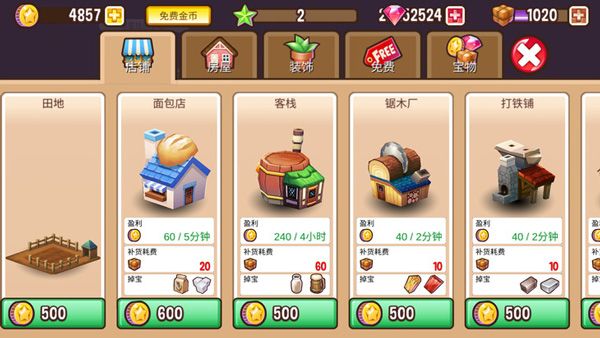 玩家在游戏中可以点击右下角的市场按钮进入店铺选择菜单,玩家在店铺菜单下可以选择自己需要的建筑来进行建造。大家需要注意店铺下面的标价哦,金钱不够的话就不能就暂时不能建造了。