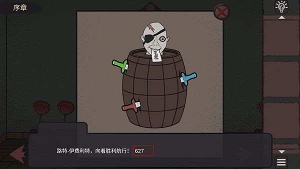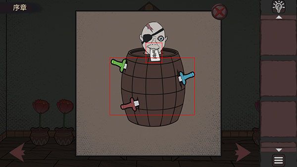 9、我们回到电视机场景,点击查看旁边的酒桶,根据提示颜色插入剑,左绿、中红、右蓝,桶中人会吐出一张纸条;