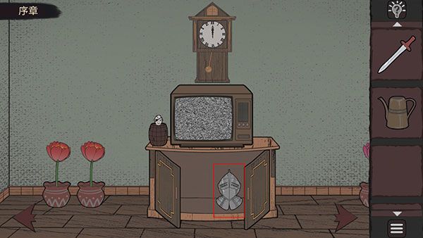 4、再向右边切换场景,将头盔放到盔甲上,并且拿到绿色手柄剑;