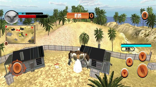 3、进入游戏,右侧轮盘控制老鹰进行移动,右侧按钮则控制老鹰下降、上升、攻击;