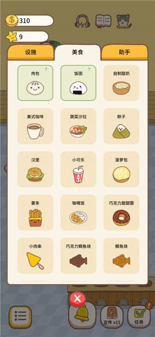 6、炉子买好了,让我们来学做第一道菜,顾客肯定会喜欢。点击菜单按钮,点击美食,选择肉包,因为美食还要有漂亮的餐桌来搭配,这里需要买一张餐桌。点击设施,然后点击小木墩进行购买即可;