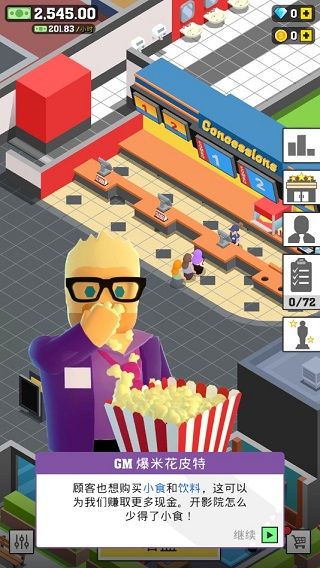 成功出售电影票,可以实现影院的创收,看顾客买完电影票哦也想购买小食和饮料,而这也是影院创收的一部分,升级糖果架可以提升单位内出售的售价,这样一来就能快速增长影院创收啦!