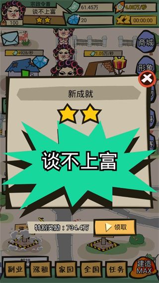 1、富贵小镇登场:点击解锁12000套平房,从此人生钱财两得意;