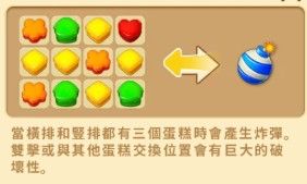 4、当横排和竖排都有三个蛋糕时会产生炸弹,双击或与其他蛋糕交换位置会有巨大的破坏性。