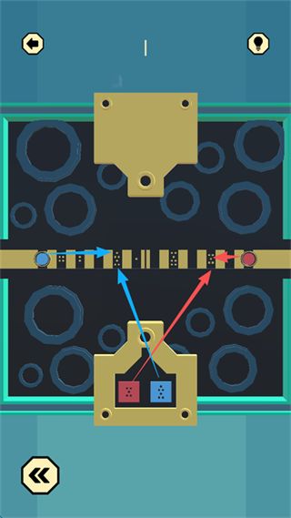 7、观察屏幕下方的“红蓝方块的空洞形状”,在上方寻找相对应的“黄点标识”,随后将相应颜色的“红蓝圆形”移动到相应的“黄点标识”。