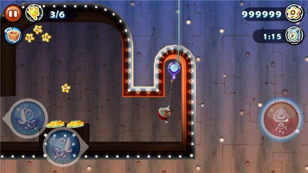 在游戏中采用的是虚拟按键的操作模式,不仅有常见的左右移动按键和跳跃按键,还有一些隐藏的按键,它们只有在需要的时候才会显示出来,将这些按键组合起来就能够控制科迪完成前进、跳跃、推动、发射绳索等等动作,在不同的场景中可能会遇到不同的组合方式,非常有创新的感觉。