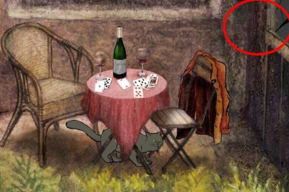 点击庭院的桌子放大,如图,点击右侧玻璃,再点击Milo,Milo进入小屋子