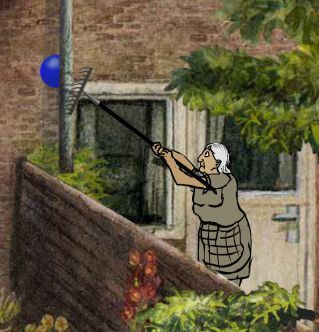 首先点击直升机,将喜鹊吓到树枝上,再点击蹦床上的男孩三次,将喜鹊吓回屋顶,此时,围墙右侧老妇人的目光会跟随喜鹊移动,当老妇人看向屋顶时,迅速点击老妇人,将柱子上的蓝球弄下来