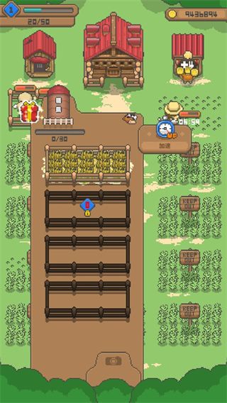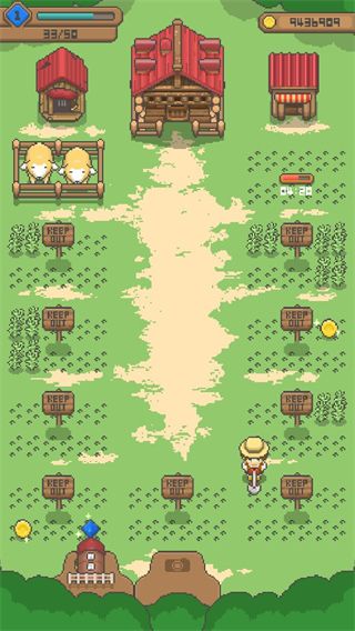 迷你像素牧场官方正版是一款农场主题的模拟经营手游。通过不断点击屏幕,收割杂草用来喂养动物,收集动物产出的道具用来卖钱,然后利用挣到的钱回收土地、扩建农场。游戏的故事就是主人公接手了叔叔的小农场,然后需要把这片农场恢复升级,初入游戏,农场还是一片荒芜,等级1级以及拥有少量的金币,经过一番简易的新手教程之后,我们就要开始自力更生啦。我们需要不断的除草养动物种树,获取蓝块升级经验和动物爱心来提升等级,收获动植物产品放到商店售卖,来获取金钱,来解锁新的动物还有田地和雇佣工。