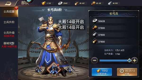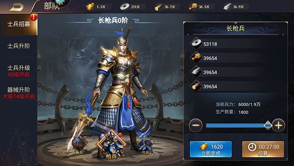士兵可大幅度提升武将战力,士兵养成包括士兵升阶、士兵升级以及兵营升级