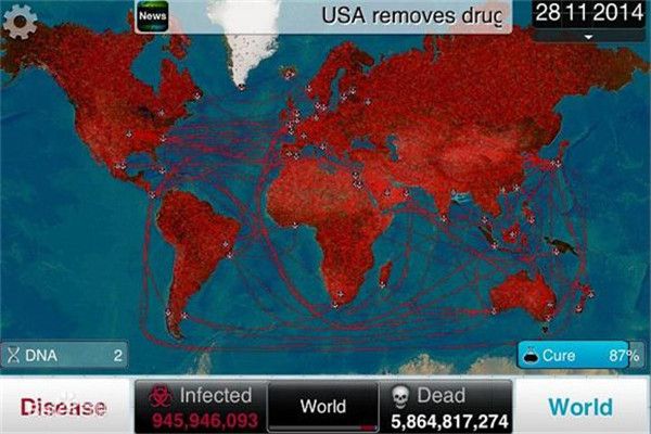 3、理论上来说游戏中建议玩家前期尽可能提升传播的速度和途径相关的,毕竟只要致死率一上去,马上就会有国家政府开始研究解药,那个时候DNA点数不是特别充足,很容易导致解药研发完成挑战失败。