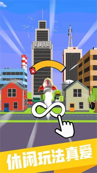 正义小火箭手游官方版是一款采用可爱动画风打造的特殊射击游戏,在这里玩家要做的就是控制好自己的火箭在城中穿行,并摧毁敌人的基地,这样就能够顺利的通关并获得相应的奖励了。游戏中玩家通过发射火箭的方式来进行进攻,对火箭的发射方向进行调试,在大楼当中进行穿梭,用最为正确的方式来命中游戏当中你所要摧毁的目标,整个过程都需要你手动进行控制,通过不断的闯关来为你解锁更多的内容;在游戏中玩家你首先就要将火箭给成功发射出去,摧毁的目标即可完成任务后可以获取丰富的金币奖励,金币可以用来升级火箭和燃料,让小火箭具有更大的威力,从而完成更加艰巨的任务。