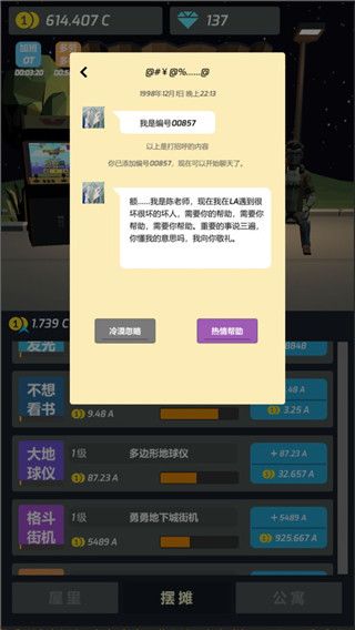 2、随时查看任务,工作室里的书、地球仪,街机格斗玩具都是打工赚的。