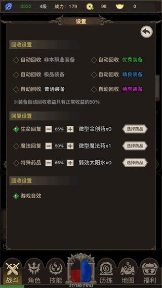 5、点击战斗界面左下角的挂机,对回收和恢复进行设置;