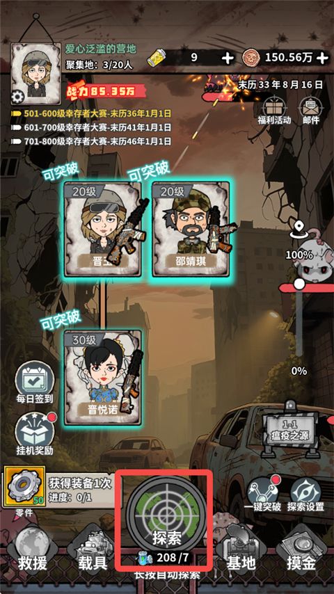 1、进入末日大本营模拟游戏,点击【探索】,每次探索需消耗电池。