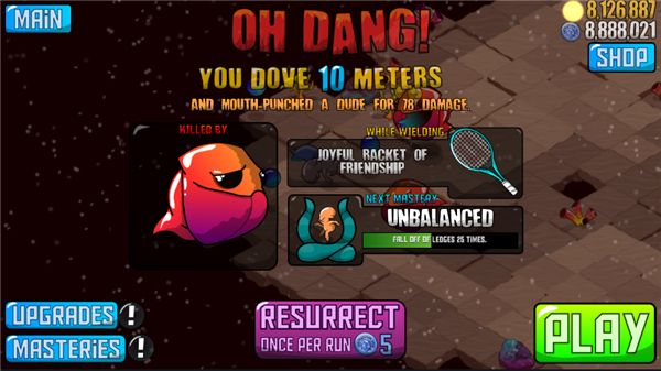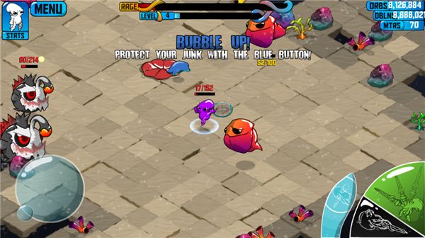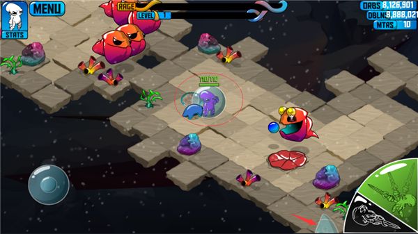 1、在每层地牢当中,都有很多长相更加奇特的怪物(龙虾不像龙虾、螃蟹不像螃蟹的),他们会吐飞弹,会射激光,个个好“流比”。好在我们“章鱼哥”的实力也很强劲。“章鱼哥”的武器很搞,刚登场时是拿着一个球拍武器,后来每下一层地牢还会出现更多奇奇怪怪的武器,棒槌、剪刀、骨棒、镰刀、还有一条形似“金箍棒”的棍状物体......各种离谱的玩意,很逗笑。当传送口亮起,就代表玩家可以进到下一层地牢。不过,建议玩家不要着急进入,先在每一层中强化自己的武器,壮大自己。随着关卡的深入,玩家会遇到各种强大的怪物,如若没有好的道具和装备支撑,很容易被 干掉。