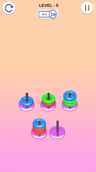3、当所有相同颜色的彩圈都堆叠在一起时,就通关了。