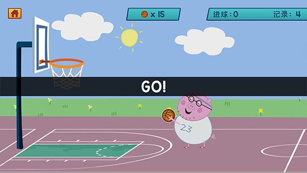 2、猪爸爸会亲身示范投篮的姿势,跟着猪爸爸一起学习即可;