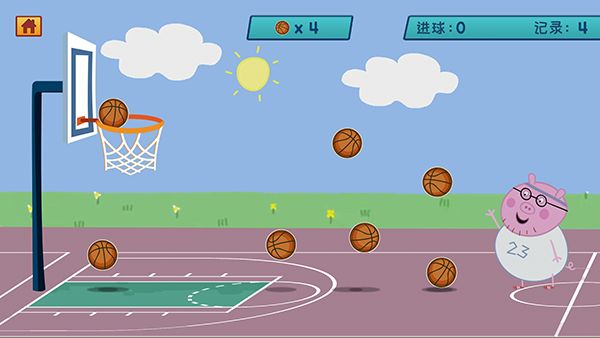 猪爸爸打篮球游戏是以小猪佩奇为主题而推出的一款休闲益智类手游,同时这款游戏也是为儿童打造的早教学习游戏,在这里面,猪爸爸将会当一名篮球教练,教大家打篮球。在游戏中,玩家需要站在三分线以外,接着就需要控制猪爸爸调节位置、篮球投射角度、弹跳力度等操作,同时,在屏幕上还会出现精准的投篮力度条,从而更好的降低投篮的难度,让每位想要学习打篮球的小朋友都可以轻松学习,十分有趣,欢迎有兴趣的玩家们免费下载体验。