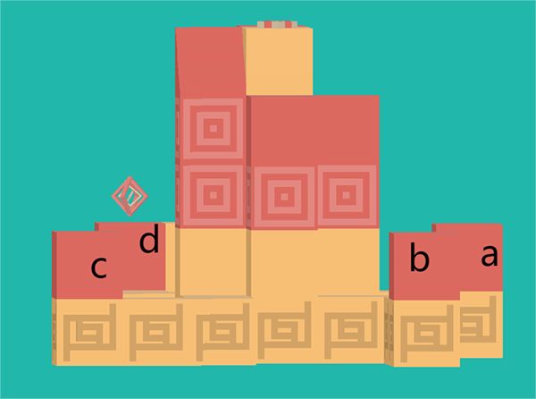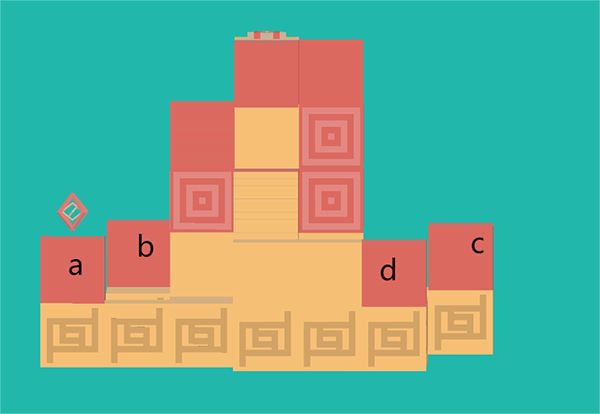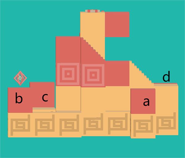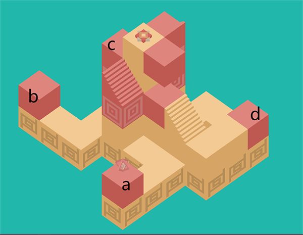 1、先给四个小红色区域标记abcd,游戏初始人物处于a。