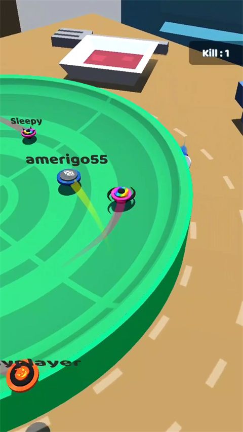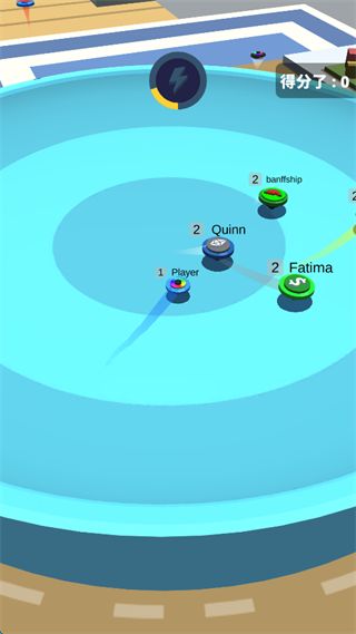3、玩家需要做的就是,确保自己不要被撞出圆盘的前提下,去撞飞其他的陀螺,赢得比分,从而增加自己陀螺的等级,体积会变得更大。
