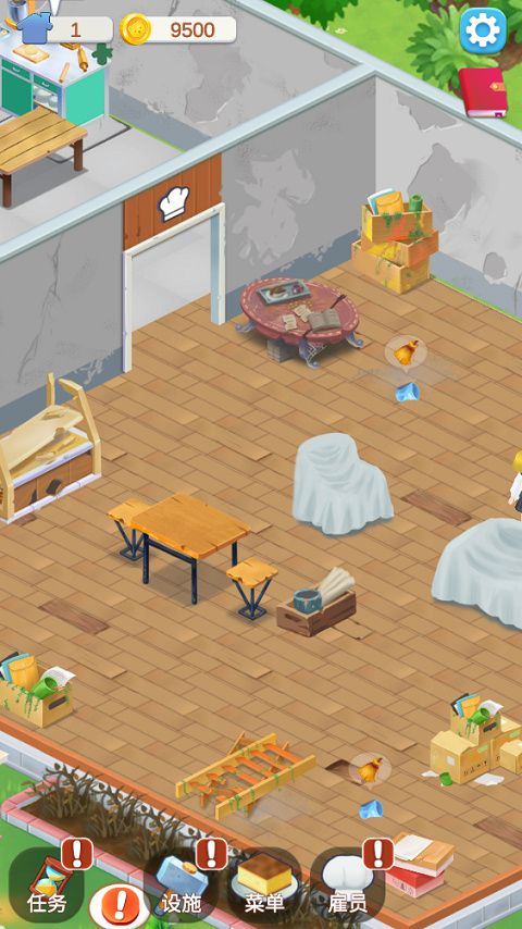 1、首先进入我的甜品店官方版,新店开业,首先为店内布置一些桌椅,点击底部的「设施」,打开面板,选择大厅,在这里选择要购买的桌椅款式。不同设施提供的评分不同,前期由于资金有限,可以先从购买最基础的设施进行布置。