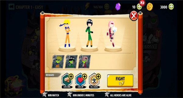 2、游戏中拥有丰富的角色供玩家解锁选择,你可以自由选择3位忍者出场并调整出战顺序,合理的搭配阵容可以让你更加轻松的赢得胜利;